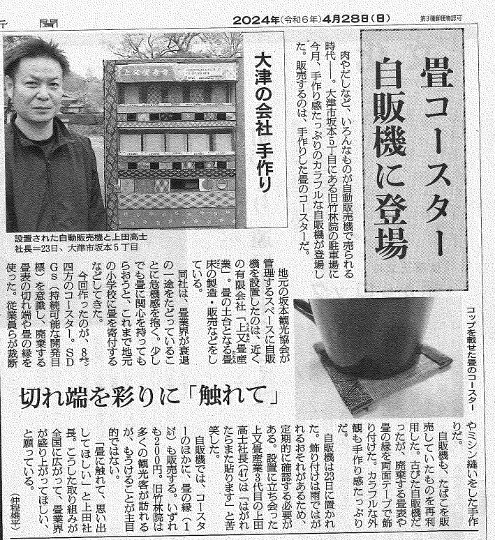 有限会社上又畳産業が令和7年1月26日の京都新聞の朝刊に掲載されました。大津百町百福物語に認定されました。比叡山の雅ー伝統のミニ畳 店頭でも販売しています。ぜひ、お立ち寄りください。